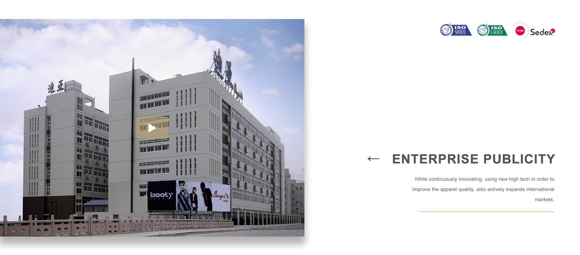 浙江迪亞服飾有限公司于1998年在世界時尚品牌之都——法國巴黎二區(qū)應(yīng)運而生。同年,在浙江省甌海經(jīng)濟開發(fā)區(qū)東方南路28號設(shè)立服裝制造工廠。公司集服裝設(shè)計、生產(chǎn)、營銷、品牌于一體,在不斷創(chuàng)新、采用高新技術(shù)提高服飾質(zhì)量的同時,積極拓展國際市場,海外營銷部長期與LV集團旗下的MAJE、SOEUR、BALIBARIS等國際著名品牌保持非常緊密的合作關(guān)系。